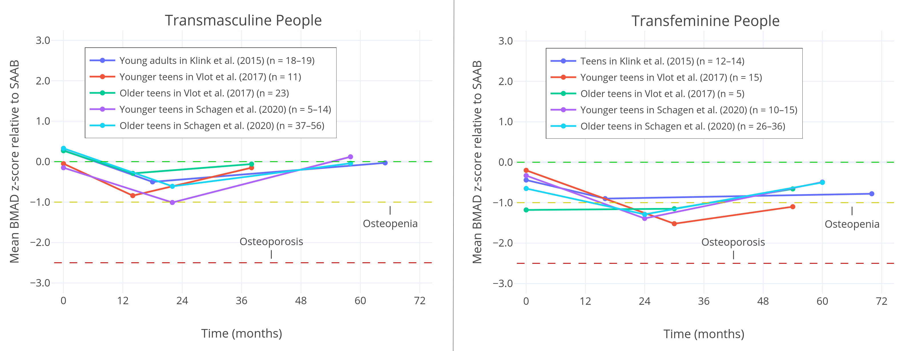 Figure 4: Bone Mineral Apparent Density (BMAD) of the lumbar spine across multiple studies, relative to sex assigned at birth. Three measurements are taken in each study: the initiation of puberty blockers, the initiation of hormone therapy, and one measurement after several years of hormone therapy. A z-score below -1 is commonly considered to be clinically relevant osteopenia, while a score below -2.5 is considered to be osteoporosis. The figure illustrates that trans girls tend to have significantly lower bone density before, during, and after treatment, while this is not the case for trans boys. Trans girls also tend to receive puberty blockers for a longer time.